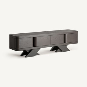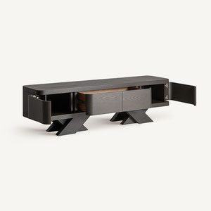 El Mueble TV Rize de VICAL presenta una estética art déco con un diseño geométrico en madera de roble en color negro.