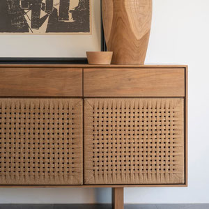 El aparador CORA WW 220 destaca por su naturalidad minimalista. Un precioso aparador de estilo rústico y acabados lisos, elaborado artesanalmente en madera de teca reciclada natural y cuerda de papel. Toda la estructura del aparador es en madera de teca reciclada, incluídas las originales patas y los dos cajones superiores. Las puertas forradas en cuerda dan ese punto de suave contraste que tanto nos gusta. Pertenece a la colección CORA, que destaca por su característico trenzado, hecho a mano por nuestros expertos artesanos. El tejido de cuerda ecológica de papel, junto a la estructura de teca reciclada natural recuperada de antiguas construcciones en desuso en Java, hacen de las piezas CORA un aliado perfecto para aquellos amantes del diseño sostenible. Un aparador ideal para recibidores con encanto, para el pasillo, el aseo o la habitación. PROXIMA LLEGADA 30/05/2026 (18 UNIDADES)