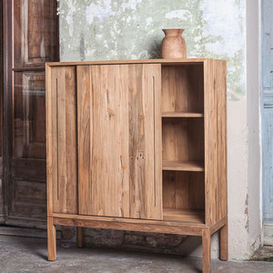 El aparador EROSI 110 Nat destaca por su adaptabilidad a cualquier espacio y un estilo decorativo verdaderamente auténtico. Un aparador vertical de madera de teca reciclada natural y estilo rústico, líneas rectas y puertas correderas de estilo japonés, detrás de las cuales se esconden unas cómodas y funcionales baldas, también de madera de teca. Pertenece a la familia EROSI, que se caracteriza por el uso de materiales nobles y sostenibles embellecidos por las inconfundibles marcas de la erosión del tiempo. Un aparador de madera de teca recuperada de antiguas construcciones en desuso de Indonesia, lo cual le aporta esa personalidad tan auténtica, a pesar de la sencillez de su diseño. El complemento versátil y funcional perfecto, que podrás utilizar en cualquier estancia. FECHA PROXIMA LLEGADA 30/05/2026 (8 UNIDADES)