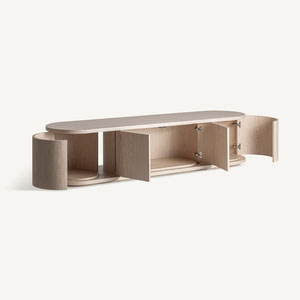 El Mueble TV Kharj de VICAL reinterpreta el art déco desde formas redondeadas y madera de roble en color beige, aportando ligereza y elegancia contemporánea.