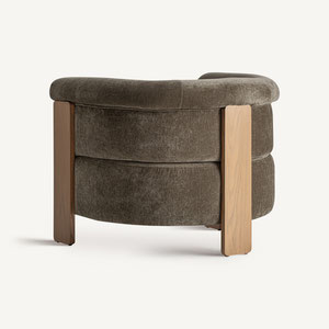 Sillón, fabricado en poliéster en color verde con acabado chenilla, combinado con madera de pino en color marrón y espuma.