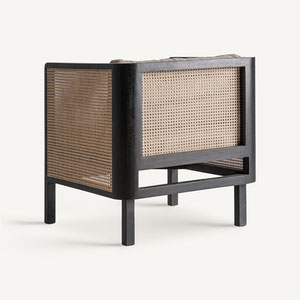 El sillón Kaleb de VICAL combina la calidez natural de la madera de mango con la ligereza del tejido en tonos crema. Su estructura negra enmarca con elegancia el entramado de rejilla, creando un juego de texturas que invita al descanso. Una pieza que equilibra modernidad y artesanía, ideal para proyectos que buscan serenidad y carácter contemporáneo.