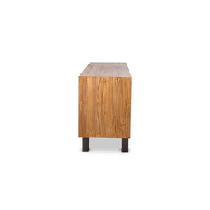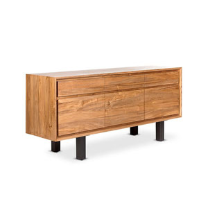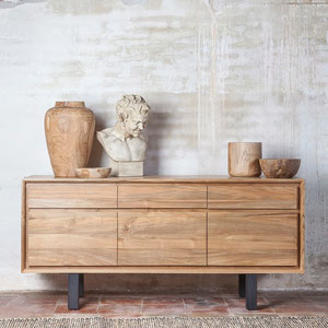 Un aparador en madera de teca reciclada natural y cuatro sobrias patas de hierro en forma cuadrada, que lo sostienen firmemente desde el suelo. Un aparador de madera de teca en el que dispondrás de una hilera de cajones superiores y otra de compartimentos inferiores, perfectos para guardar lo que necesites. De la familia LOX, creadora de diseños de lujo con materiales nobles, pero siempre pensando en la utilidad del día a día. Este aparador artesanal ha sido construido a mano por nuestros artesanos, a partir de teca recuperada de antiguas construcciones en desuso en Java, Indonesia. Perfecto para estancias de todos los tamaños y estilos decorativos exigentes. FECHA APROXIMADA DE LLEGADA 30/05/2026 (13 UNIDADES)